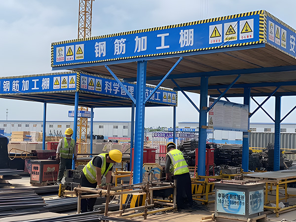 施工鋼筋加工棚是在木工加工場地、鋼筋加工場地等上方有可能掉落物件或處于起重機(jī)調(diào)桿回轉(zhuǎn)范圍之內(nèi),搭設(shè)的雙層防護(hù)棚,用于保護(hù)施工人員。