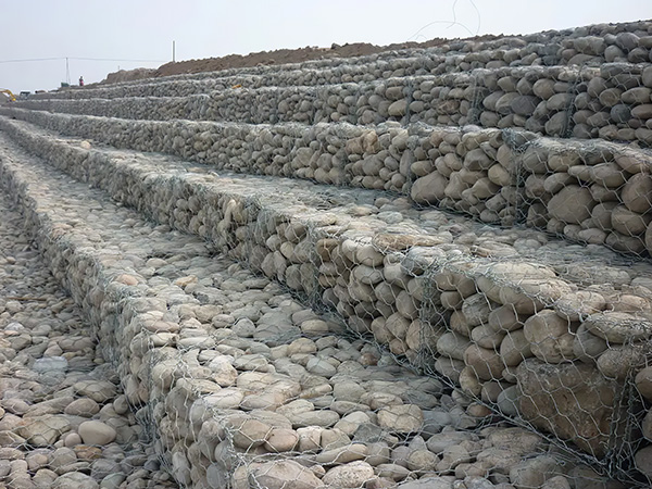 石籠網(wǎng)中裝入石塊等填充料后連接成一體,成為主要用于水利工程、海防工程、生態(tài)河道建設、生態(tài)邊坡治理的防汛石籠網(wǎng)。