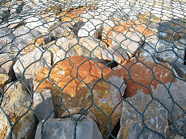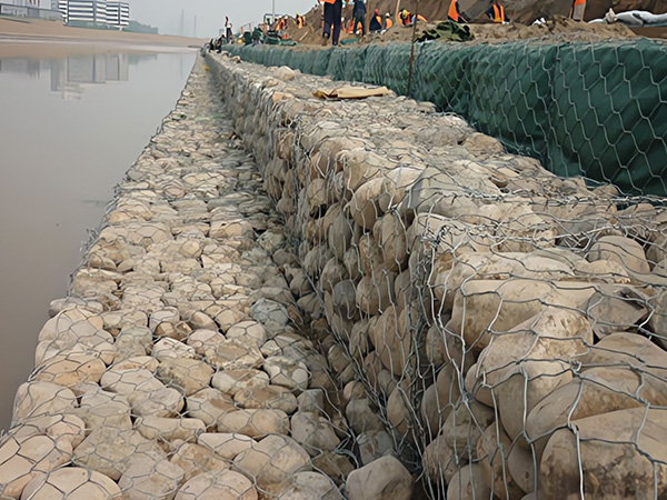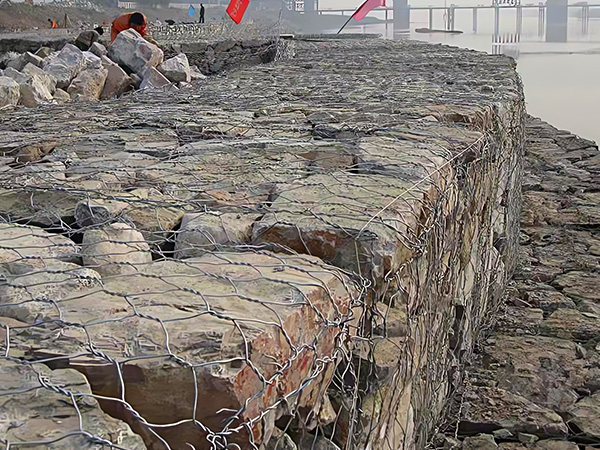 石籠網(wǎng)中裝入石塊等填充料后連接成一體,成為主要用于水利工程、海防工程、生態(tài)河道建設、生態(tài)邊坡治理的防汛石籠網(wǎng)。