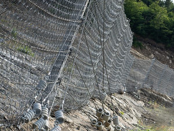 是在公路邊立一道鋼絲繩網(wǎng)和菱形網(wǎng)復(fù)合防護(hù)層,如有跌落的石頭將被網(wǎng)子擋住,保護(hù)下面的汽車(chē)等,這種方式應(yīng)用于坡度小的山崖防護(hù)