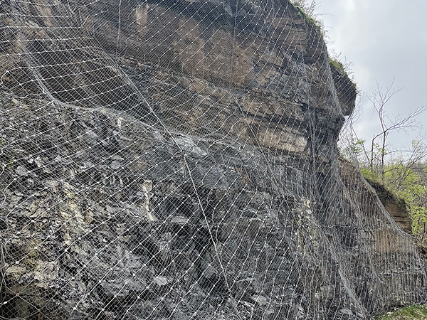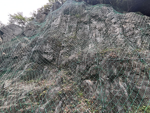 是以鋼絲繩網(wǎng)為主的各類柔性網(wǎng)覆蓋包裹在所需防護(hù)斜坡或巖石上,以限制坡面巖石土體的風(fēng)化剝落或破壞以及為巖崩塌(加固作用),或?qū)⒙涫刂朴谝欢ǚ秶鷥?nèi)運(yùn)(圍護(hù)作用)。