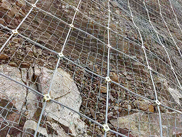 是以鋼絲繩網(wǎng)為主的各類柔性網(wǎng)覆蓋包裹在所需防護(hù)斜坡或巖石上,以限制坡面巖石土體的風(fēng)化剝落或破壞以及為巖崩塌(加固作用),或?qū)⒙涫刂朴谝欢ǚ秶鷥?nèi)運(yùn)(圍護(hù)作用)。